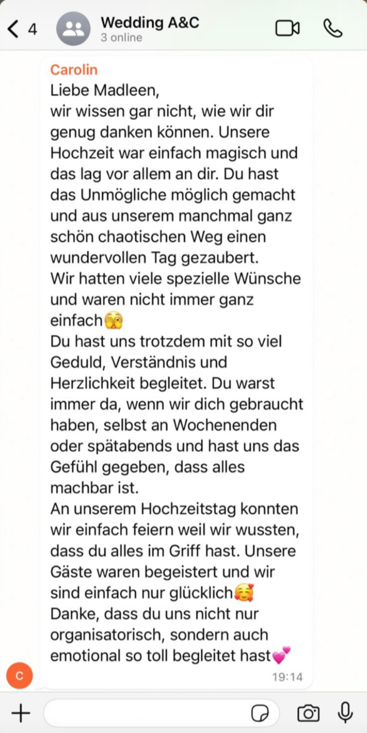 Rosenbaum Weddings 30 Google BewertungenGepostet auf Yana Marina Joos Dank der lieben Madleen konnten wir alle Wünsche und Vorstellungen von unserer Traumhochzeit verwirklichen. Sie hat uns von Anfang an liebevoll unterstützt und hatte immer ein offenes Ohr, wenn wir einmal nicht weiter wussten. Wir können ihre Arbeit nur wärmstens weiter empfehlen und sind dankbar, sie gefunden zu haben!Gepostet auf Ann-Christin Röwekamp Ich habe Madleen bei der Hochzeit einer Freundin kennengelernt. Ich bin absolut begeistert von der Arbeit von Madleen! Sie hat die Hochzeit zu einem unvergesslichen Erlebnis gemacht. Besonders beeindruckt hat mich ihre Fähigkeit, alle die Ideen zu verstehen und sie auf eine ganz besondere Weise zu realisieren. Sie hat dem Brautpaar immer wieder kreative Vorschläge gemacht, die die Hochzeit zu etwas Einzigartigem gemacht haben. Auch als es in den letzten Wochen vor der Hochzeit etwas stressiger wurde, war sie immer ruhig, organisiert und hat uns (Trauzeugen, aber auch dem Brautpaar) die Last abgenommen. An dem Hochzeitstag hat sie alles perfekt koordiniert, sodass wir uns völlig entspannt auf den Tag freuen konnten. Ich kann Madleen nur wärmstens empfehlen! Wer auf der Suche nach einer engagierten, kreativen und äußerst zuverlässigen Planerin ist, ist hier genau richtig. Vielen Dank für alles!Gepostet auf Kea Ulrich Ich habe als Fotografin mit Madleen zusammengearbeitet und kann sie jedem Brautpaar von Herzen weiterempfehlen. Die Arbeit mit ihr war zu jeder Zeit sehr professionell & angenehm. Madleen ist eine sehr kreative, einfühlsame und freundliche Hochzeitsplanerin, mit der es einfach Spaß macht. Sie weiß genau wie Sie die Vorstellungen umsetzen möchte bzw. kann und hat dies auch in Kürze auf die Beine gestellt. Ich freue mich auf weitere Projekte mit ihr!Gepostet auf Camelia Voigt Mit viel Liebe zum Detail, alles sehr gut und stimmig organisiert hat die liebe Madleen, die Hochzeit unserer Freunde betreut. Ihre offene, humorvolle und liebevolle Art hat uns sehr gefallen. Sie war sehr zuverlässige und hat total professionelle Arbeit geleistet. Sie ist besonders auf die perfekte Umsetzung aller Wünsche des Brautpaares eingegangen. Sie hatte am Tag der Hochzeit alles im Blick gehabt, sodass das Brautpaar sich auf die schönen Dinge konzentrieren und den Tag genießen konnte. Wenn ihr auch einen Ansprechpartner sucht, der immer ein offenes Ohr und eine Lösung hatte, kann ich euch Madleen von Herzem empfehlen. Vielen Dank für alles 😊Gepostet auf Jeanette.N Madleen ist eine liebevolle und soo sympathische Person! Ihre zielstrebigen und organisatorischen Fähigkeiten, sowie die Liebe zum Detail, machen ihre Arbeit einfach perfekt! Ich kann jedem Madleen nur von Herzen empfehlen !!!!Gepostet auf ADORE. Wedding Content Creator Mit Madleen als Hochzeitsplanerin an eurer Seite trefft ihr die richtige Wahl! Sie überzeugt nicht nur durch ihre herzliche Art, sondern auch durch ihre ausgezeichnete Organisation. Wir fühlen uns bestens aufgehoben und wissen, dass unsere Hochzeit in guten Händen ist. Schon unser erstes Gespräch war äußerst positiv und wir freuen uns auf die bevorstehende Zusammenarbeit!Gepostet auf Wibke Zeisberg Madleen ist eine ganz sympathische, liebenswerte junge Frau mit dem Herz am rechten Fleck. Man merkt, dass sie mit vollem Einsatz die Events angeht und alles bis ins kleinste Detail plant und nichts dem Zufall überlässt. Sie hat tolle Ideen und man fühlt sich bei ihr gut aufgehoben. Daumen hoch und absolut zu empfehlen.Gepostet auf Pia Krüper Madleen ist eine super empathische und ideenreiche Person, die immer mit einem offenen Ohr für einen da ist. Ich durfte Madleen schon in vielen unterschiedlichen Bereichen kennenlernen und war immer wieder von ihrer sympathischen Art und Planungsfähigkeit beeindruckt. Ich kann Madleen wärmstens empfehlen, denn ihre Leidenschaft für das Planen von Hochzeiten macht sie zu einer ausgezeichneten Wahl für jedes Brautpaar, das einen unvergesslichen Tag erleben möchte.Gepostet auf ZiPainz EU Madleen stand uns bei der Planung mit Rat und Tat zu Seite. Sie hatte tolle Ideen und hat diese zuverlässig und wunderbar umgesetzt. Wir sind super zufrieden mit ihrer Arbeit!Gepostet auf Sandra Kolosser Madleen ist ein überaus herzlicher und toleranter Mensch, mit grosser Planungssicherheit und Zuverlässigkeit. Bei ihr ist man in guten Händen!
